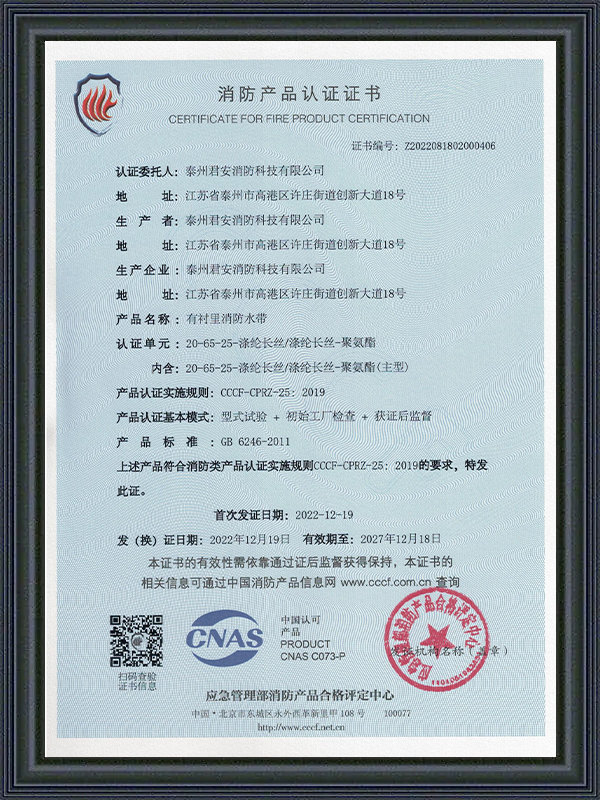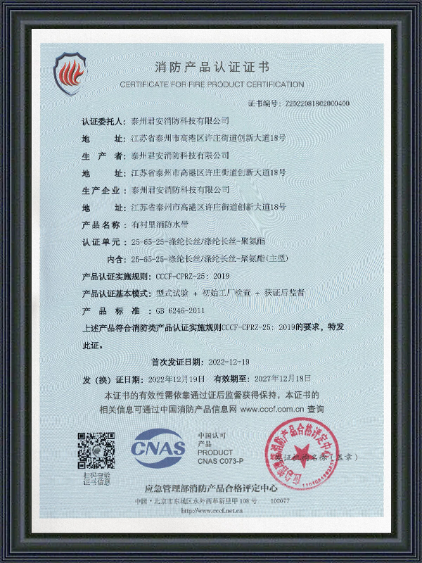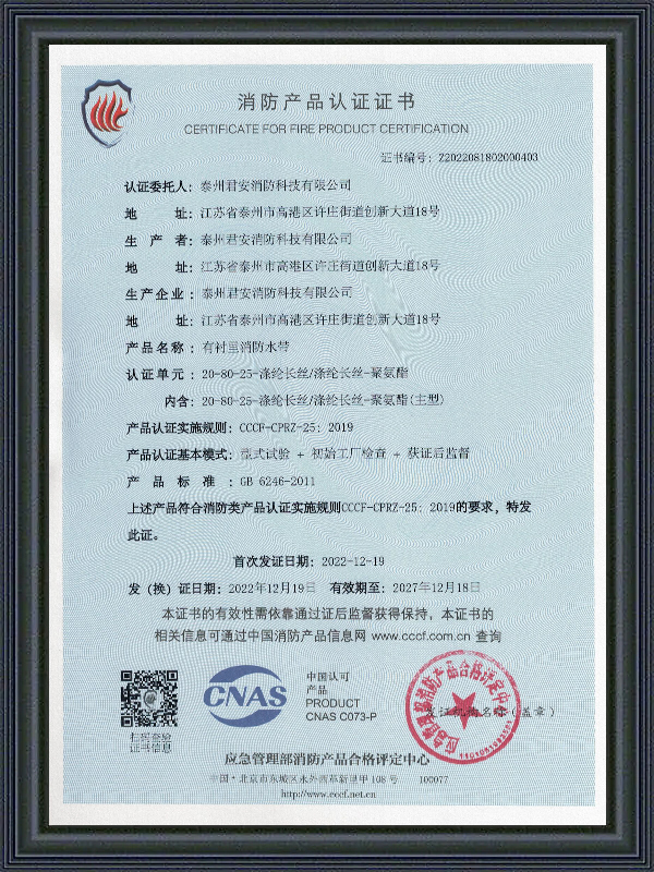 Taizhou Jun'an Fire Technology Co., Ltd., som er en virksomhed med speciale i produktion af brandslanger, brandslukningsudstyr og nødredningsudstyr, er blevet førende i branchen med sin stærke produktionsteknologi og rige brancheerfaring. Virksomheden er beliggende nær Shanghai, verdens største handelshavn, med en overlegen geografisk placering og kan reagere hurtigt på markedets efterspørgsel.